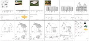 Complete set of timber cabin plans (pdf): layouts, details, sections, elevations, material variants, windows, doors.