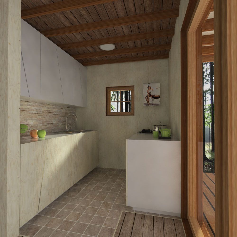 Genesis has a specific crooked look, which gets much attention. The gabled roof lands onto two sides of the porch to cover up the entrances into the cabin. On the Genesis plans, you can see the partition of the “public” lively zone on the ground floor and the “private” calm zone on the upper floor. In practice, you will find the main room, kitchen, and bathroom downstairs and two bedrooms upstairs. The forest environment would suit Genesis as a holiday cottage or a hunting cabin – it’s up to you! If not decided yet, check other house plans.