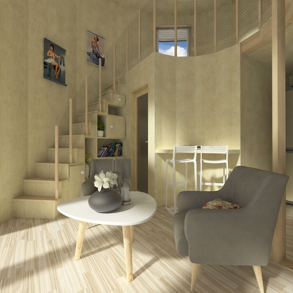The absolutely adorable Eleanor small house plans are here for you to order! The roundhouse is uneasy about planning, but having a closer look at the plans, everything within the space works, and you’re not wasting any room. You will find the living room with an entry to the kitchen zone and the door to the bathroom on the ground floor. Alongside the curved wall, stairs lead upstairs to the loft where the bedroom is. From there, you have an overview of the whole space and a proportionally generous number of windows. The kitchen is divided from the living room by the beams that bear the load from the loft slab, and it also has a nice visual touch to space.