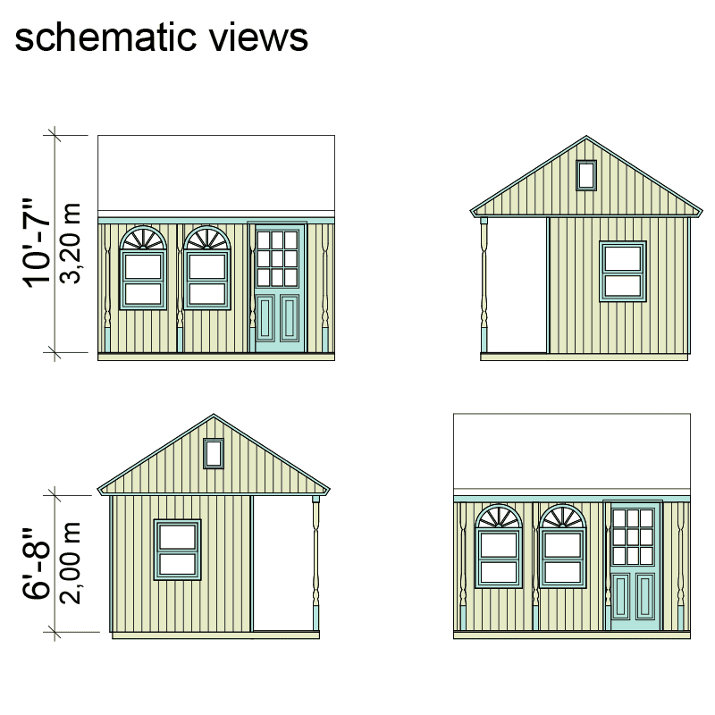 Lynda is a 152 sq. ft. / 14,1 m2 one bedroom Victorian tiny shed plans. Its 11′-6″ x 10′-2″ / 3,5 x 3,05 m space includes 37 sq. ft. / 3,4 m2 front porch, spacious central room and 85 sq. ft. / 7,9 m2 sleeping loft.