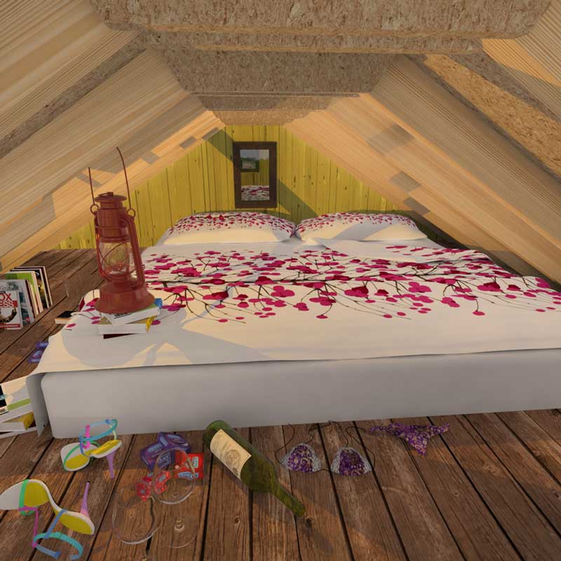 Lynda is the Victorian style design of our tiny cabins. With its traditional look and gable roof with wooden shingles, it is a very charming little place divided into two areas. The room on the ground floor can be used as a socializing space to hang out with a friend, study, reading room, or anything else you wish. In all cases, it benefits from a lot of light coming in from windows on three sides and, more importantly, direct access to the front porch. With its picturesque Victorian-style columns, it is a great place to enjoy fresh air, sunshine, and views of the surrounding nature, and as it is entirely covered, not even bad weather will stop you. Another part of Lynda is its loft. A convenient addition to tiny cabins leaves more space on the ground floor to be used for daytime activities. It provides a nice cozy but spacious sleeping place, where you can enjoy moments of rest even during the day, as it has two gable end windows for the light.