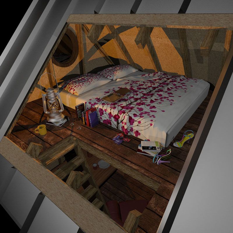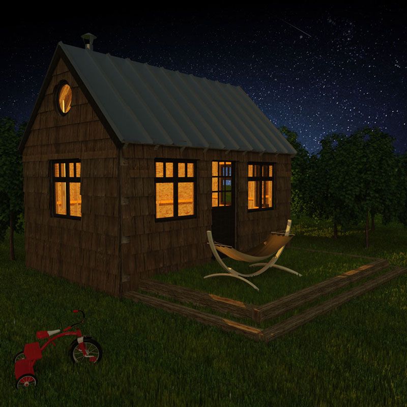 DIY cabin Carroll is a charming small cabin with a porch. Its characteristic feature is the traditional look of small wooden houses, with a gable roof, symmetrical design, and main entrance in the center of one of the walls. In this case, it is in the longer wall connecting the interior with Carroll’s front porch, which is an enjoyable addition to the cabin, as you can spend a lot of time there enjoying the fresh air, sunshine, views all around, and peace. The interior of Carroll is very cozy. You can have some comfortable sofa and dining space on the ground floor, for example, or a working table, or socializing place, or anything else you wish. A log burner will add a warm and homey atmosphere no matter what you will do, and windows on three sides will bring enough light. When you get tired, a few little wooden steps will lead you to a sleeping loft with another two windows, so you can get your well-deserved rest while observing stars in the night sky or enjoying a view of the nature around you in your small cabin with porch.