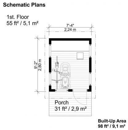 Bebe is a charming 69 sq. ft. (6,4 m2) wooden shed. It consists of 9′-2″ x 7′-4″ (2,8 x 2,3 m) room, gable roof and 31 sq. ft. (2,9 m2) front porch.